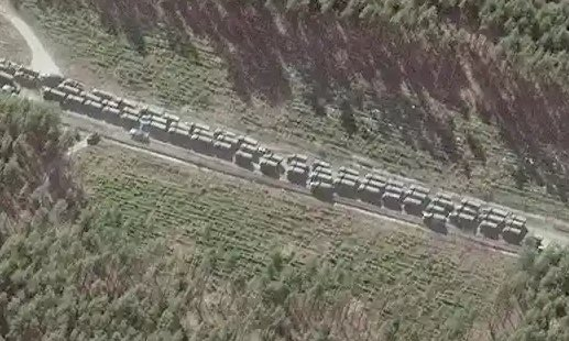 There are 60(+) Russian army trucks crowded & parked on this raised road bed to avoid the fate of the mud-bogged Pantsir-S1.